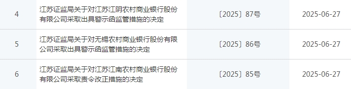 江苏江阴农商行、无锡农商行被警示,江南农商行被责令改正。